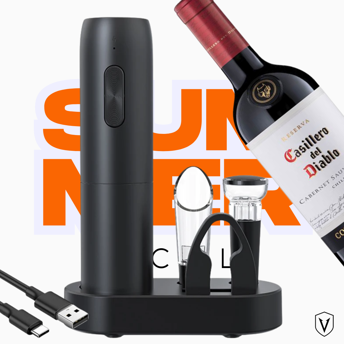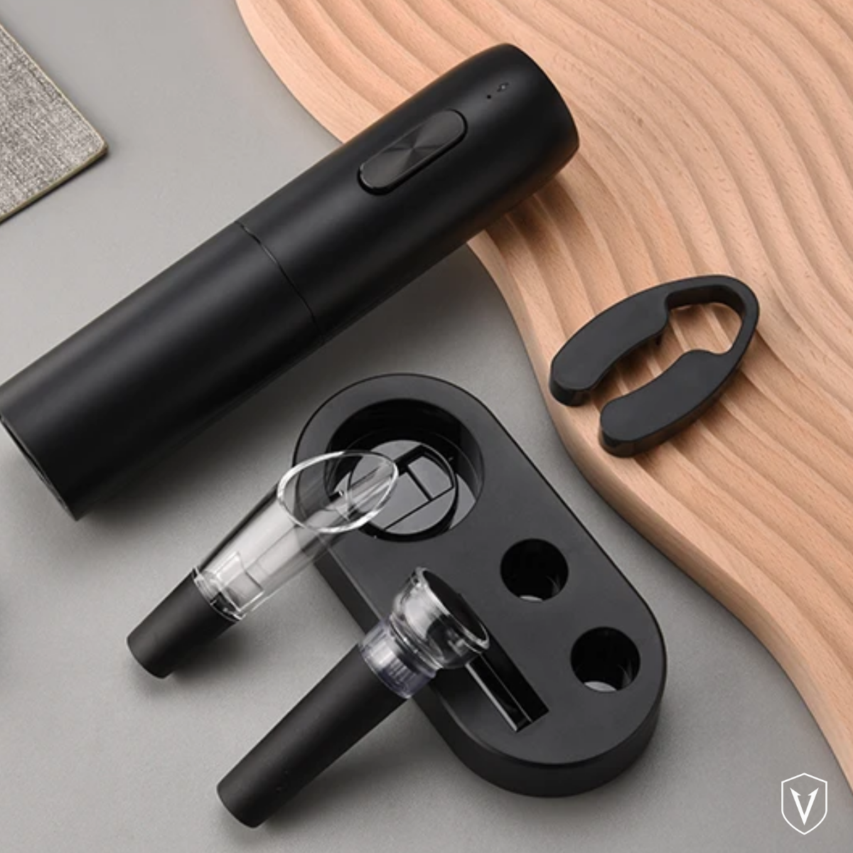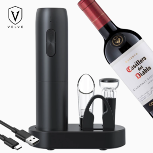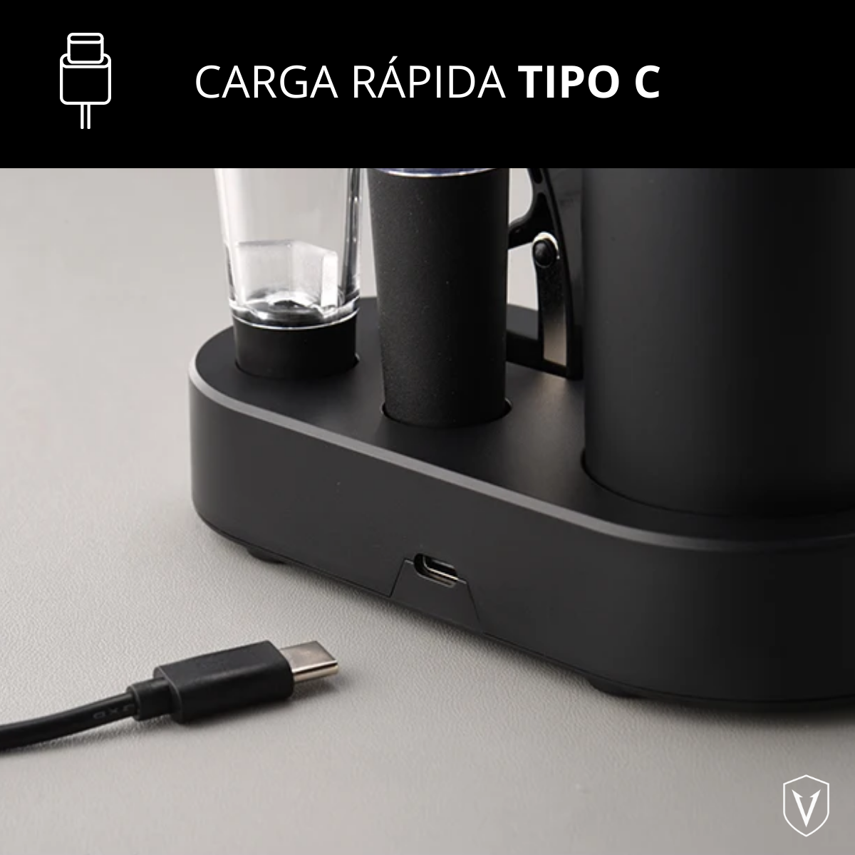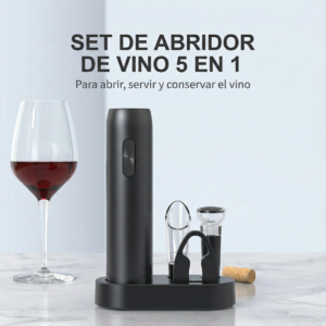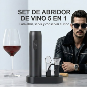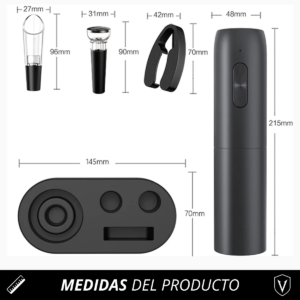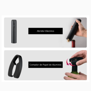 Incluye: Abridor eléctrico + Cortador de cápsulas (foil cutter) + Tapón de vacío (mantiene el vino fresco por 7 días) + Aireador de vino (bubbler) + Cable de carga USB.